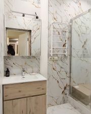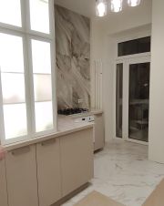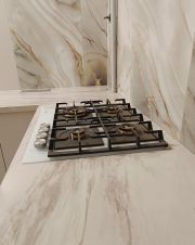 -Отделка стен кухни керамогранитом под мрамор является одним из самых модных решений в современном дизайне.