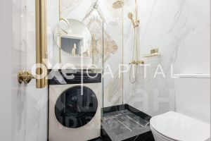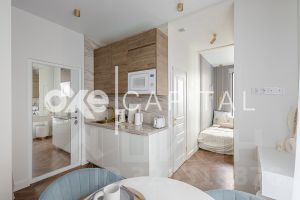 Квартира полностью укомплектована мебелью. Установлен кухонный гарнитур с посудомоечной машиной, и необходимой для проживания техникой: варочная плита, тостер, чайник, микроволновая печь, холодильник. Из окна открывается вид на Москва-Сити.