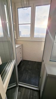 Облагороженный балкон с диваном, 2 с/у, большой коридор, обустроенная гардеробная.