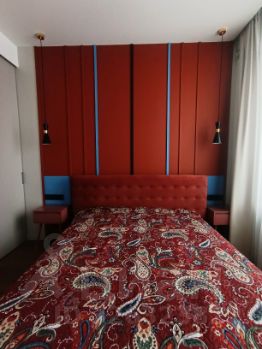 - в спальне: большая кровать с прикроватными дизайнерскими тумбами и незаметный, но вместительный шкаф-купе.