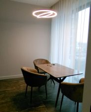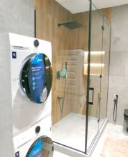В апартаментах выполнен евро ремонт и создана атмосфера комфорта и стиля. В комнате и на кухне предусмотрена вся необходимая мебель в иом числе двуспальная кровать с подъёмным механизмом в стену, которая гармонично вписывается в общий интерьер. Из техники вы найдете кондиционер, холодильник, посудомоечную машину, телевизор и стиральную машину, а так же сушильную машину (видны на фото в ванной комнате). Ванная комната просторная и оборудована большой душевой кабиной.