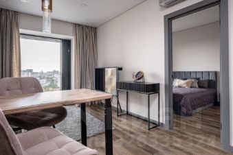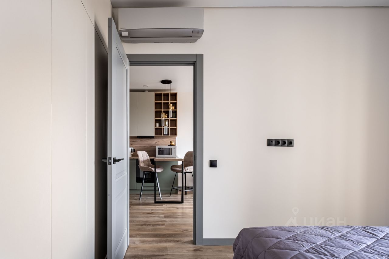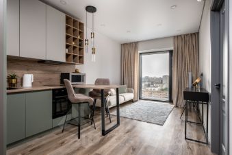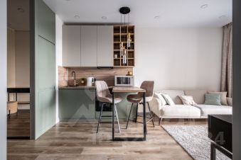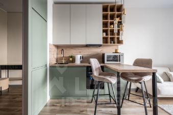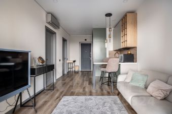 Состоит из холла, изолированной комнаты, кухни-гостиной, гардеробной и совмещенного санузла