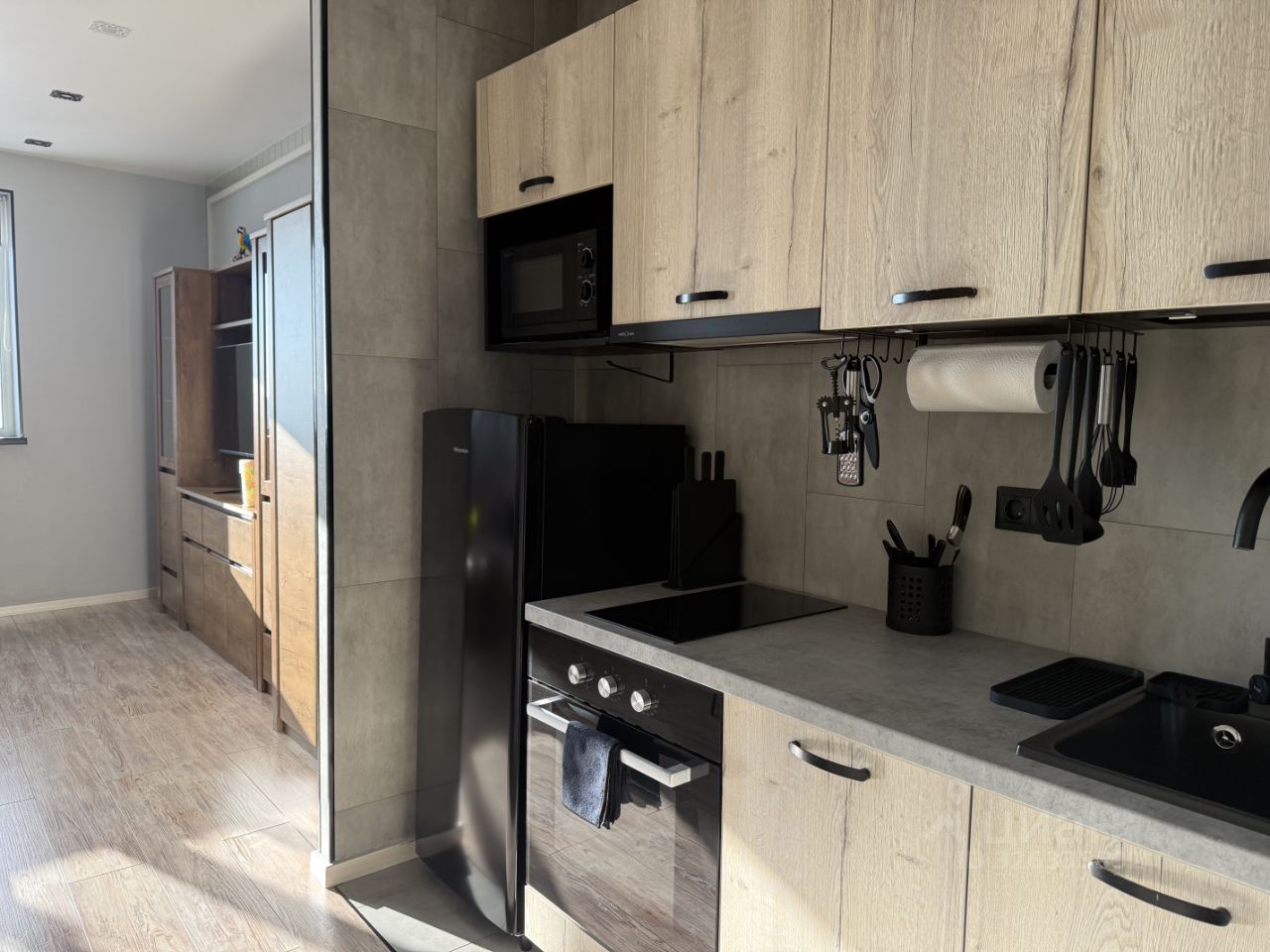 * кухня, для ежедневной готовки, аккуратно интегрирована, не нарушает целостность пространства