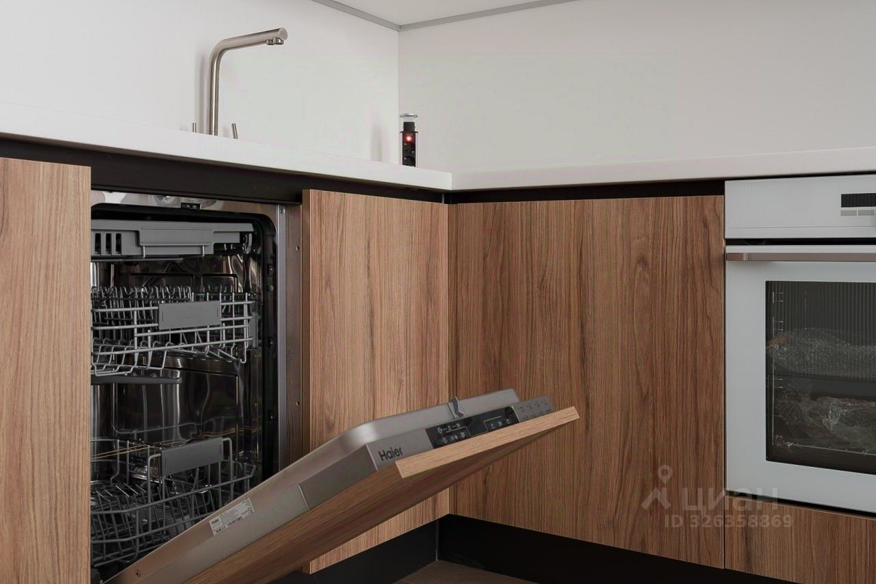 Новая техника: ТВ 50 дюймов, посудомоечная машина, духовой шкаф, варочная панель, холодильник, вытяжка, стиральная машина.