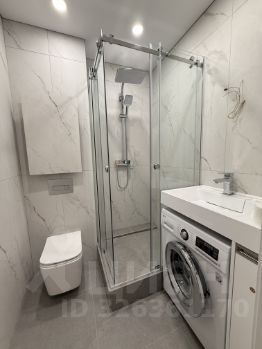 Совмещенный, в современной отделке: душевая кабина, стильная сантехника, теплый пол.