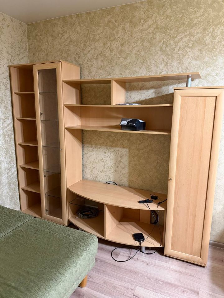 Kомнaтa: новый диван, мебельный гарнитур, просторный шкаф, столик, балкон.