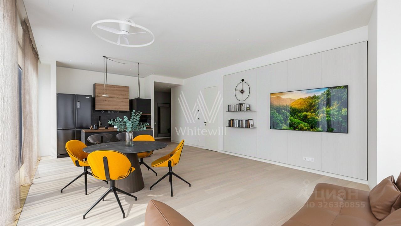 Спланирована кухня-гостиная с островом и обеденной зоной. Вся техника на кухне Smeg, телевизор LG.