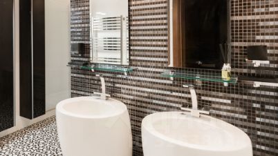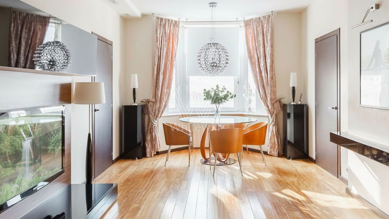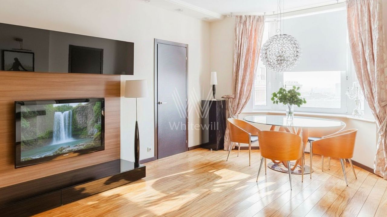 Бонус партнёрам 50%. Квартира с 2 спальнями общей площадью 140 м² в комплексе премиум-класса "Триумф Палас" в Хорошёвском районе. Интерьер оформлен в современном стиле в лаконичных светло-бежевых тонах. Спланирована гостиная, кухня, спальня, кабинет или вторая спальня, гардеробная комната с окном, ванная комната, санузел с душем, постирочная. Квартира полностью меблирована и укомплектована техникой. Установлена система кондиционирования, стиральная и посудомоечная машина. Из окон открывается вид на улицу и во двор.