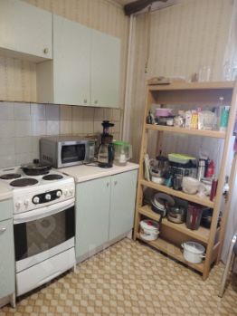 В квартире просторная кухня 10 м2, холодильник, стиральная машина-автомат. Есть кухонный гарнитур,плита и духовка.