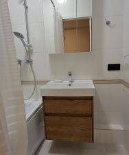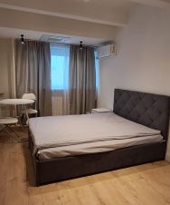 В квартире сделан качественный евроремонт, создающий современную и уютную атмосферу. Здесь есть вся необходимая мебель как в комнате, так и на кухне. Из техники — кондиционер, холодильник, телевизор и стиральная машина. Ванная комната оборудована ванной, что позволит вам расслабиться после длинного дня.