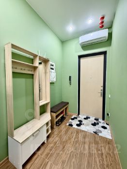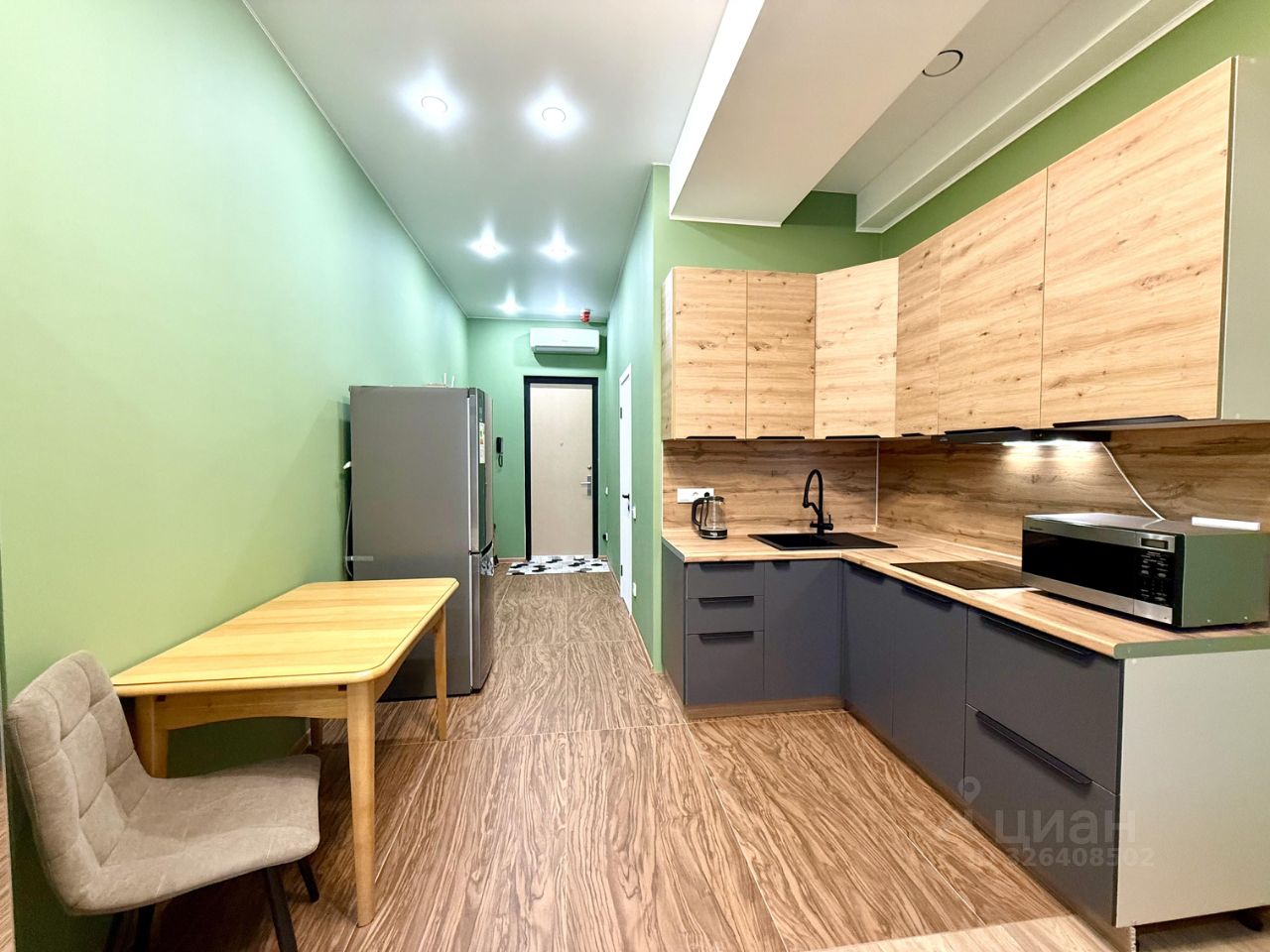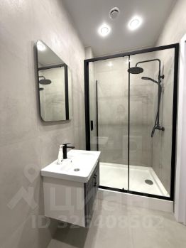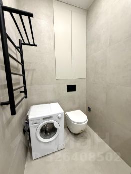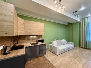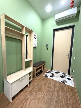 В студии есть всё необходимое: современная мебель на кухне и в комнате, а также техника — кондиционер, холодильник и стиральная машина. Санузел совмещён, оборудован душевой кабиной.