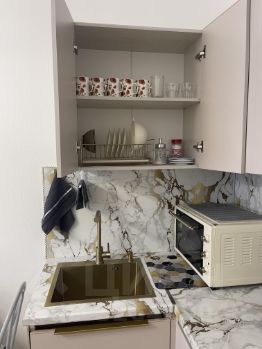 • Для кухни: базовая бакалея (сахар, соль, чай/кофе), вся посуда, плита, холодильник, микроволновка, электрочайник, стиральная машина с порошком.