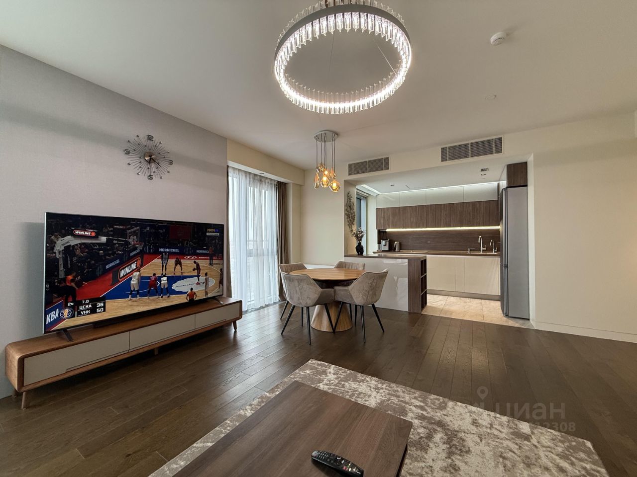 - большая гостиная с кухонным островом, рабочей и тв зоной