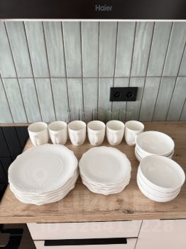 - Полный комплект посуды, приборы, сковорода, кострюля