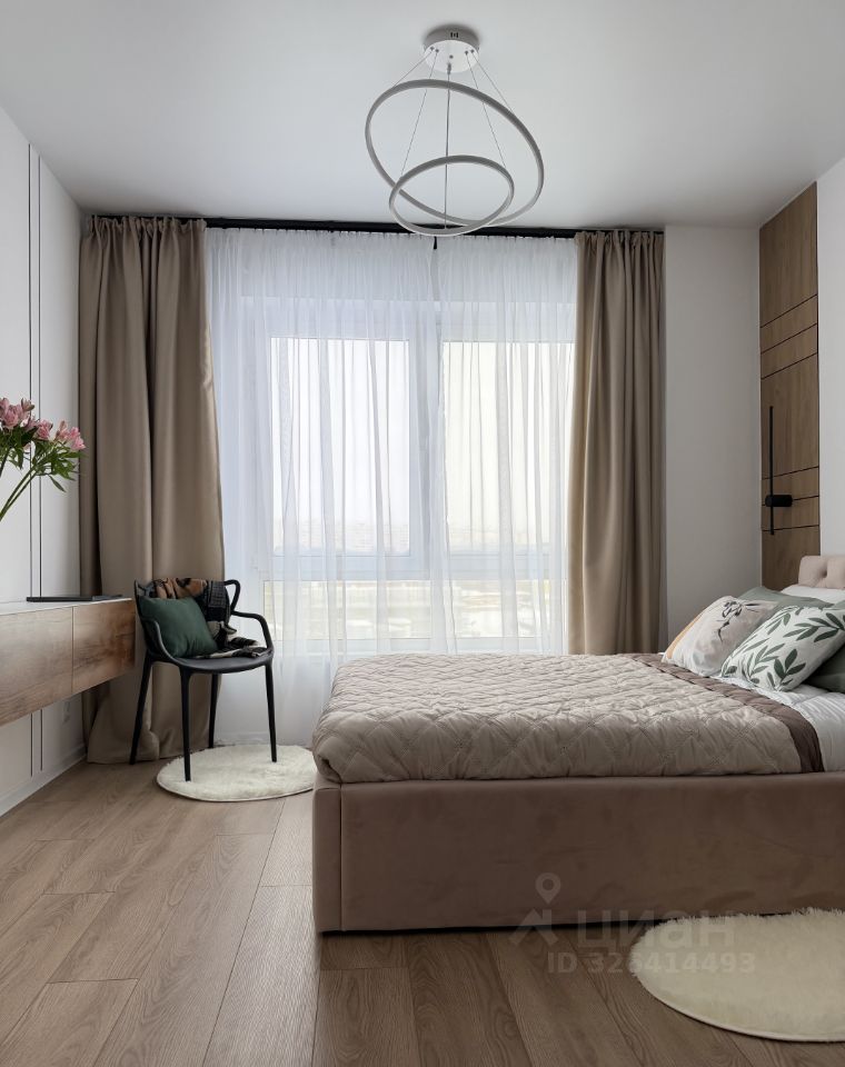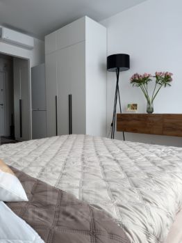 Установлен кондиционер (сплит-система), двухспальная кровать 140см с ортопедическим матрасом и наматрасником, два вместительных шкафа, тв.тумба, обеденная зона.