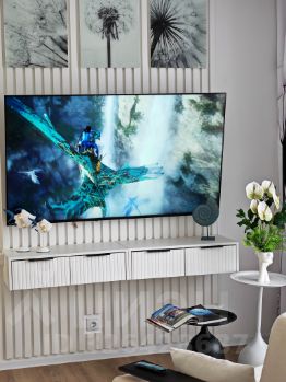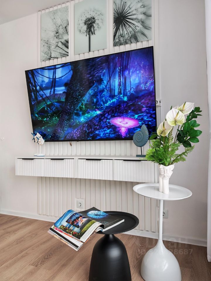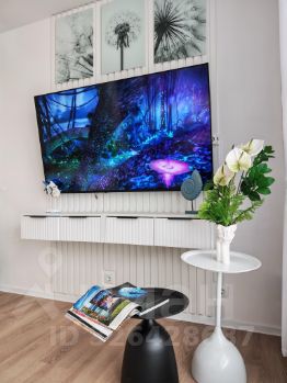 Имеется большой телевизор (диагональ 65"), мебель для комфортного проживания: большая кровать с ортопедическим матрасом, подушками, двумя теплыми одеялами и водонепроницаемым наматрасником в уютной спальне, современный вместительный шкаф в отдельной гардеробной с зеркалом, удобные тумбочки в гостиной и зеркальный шкаф-купе в прихожей, раскладной диван в гостиной и удобный круглый обеденный стол со стеклянной столешницей и 4-мя стульями.