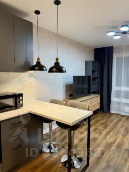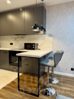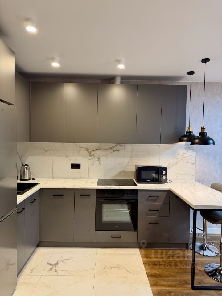 Кухонный гарнитур со всей необходимой техникой (варочная панель, духовка, вытяжка, холодильник, посудомоечная машина, стиральная машина), эстетичная барная стойка.