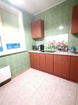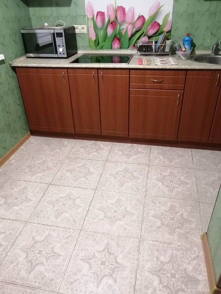 Не перегружена мебелью, при этом есть все необходимое для проживания: 2-х камерный холодильник, плита стеклокерамика , 2-х спальная кровать, диван раскладывается (при желании можно поставить на кухню). Стенка в отличном состоянии — много места для хранения. Санузел в плитке до потолка, СМА, сантехника чистейшая. На окнах рулонные шторы, но есть карнизы для обычных.