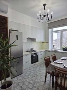 Кухня укомплектована всей необходимой техникой включая посудомойку. Есть комплект посуды на 6 персон, сервировочная посуда и посуда для запекания. Подсветка рабочей зоны димируемая, сенсорная. Раковина расположена у окна. Установлен кран с фильтром для питьевой воды и дозатор для моющих средств.