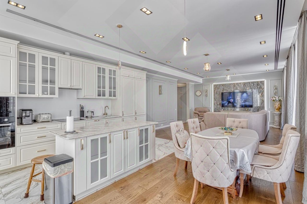 По планировке: просторная кухня-гостиная-столовая 54м, 2 спальни, 1 кабинет, 2 полных санузла, гардеробная комната, прихожая с вместительным шкафом. Потолки 3,2 м.