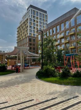 Двор без машин с ландшафтным дизайном, зонами отдыха, детскими площадками.