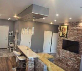 Гостиная-кухня 32 м² с мебелью (Стильные кухни), техникой Bosch/Elica (холодильник, широкая посудомойка 60 см, духовка, микроволновка, измельчитель, вытяжка, фильтр воды), раскладным диваном, барной стойкой, зонами подсветки, раздвижным столом. Спальни: взрослая 14 м² (широкий шкаф, вид во двор), детская 12 м² (двухъярусная кровать 1,8 м, балкон 1х4 м с полками). 2 раздельных санузла (стиралка-сушилка 8 кг + мебель, ванная с бойлером Ariston), кондиционер в гостиной, утюг, гладильная доска.