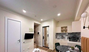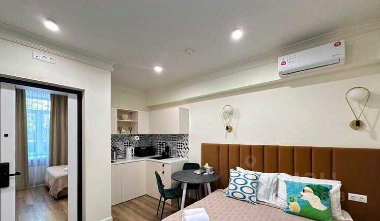 Сдаётся студия площадью 14 кв.м. с дизайнерским ремонтом на 1 этаже в 11-этажном доме на срок от 11 месяцев. Укомплектована всей необходимой бытовой техникой - стиральная машина, холодильник ,кондиционер, телевизор, микроволновка. Есть бойлер.