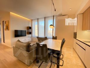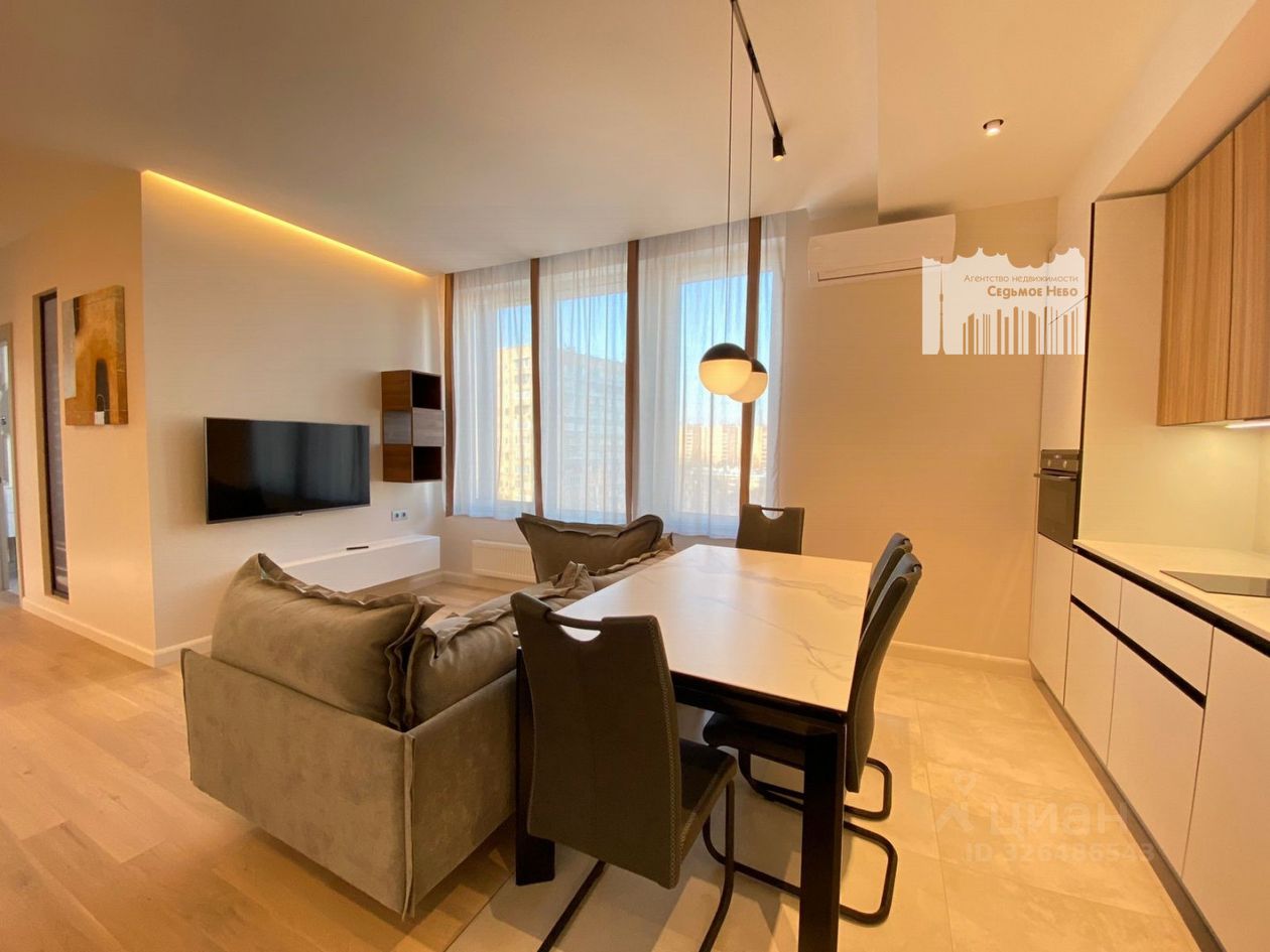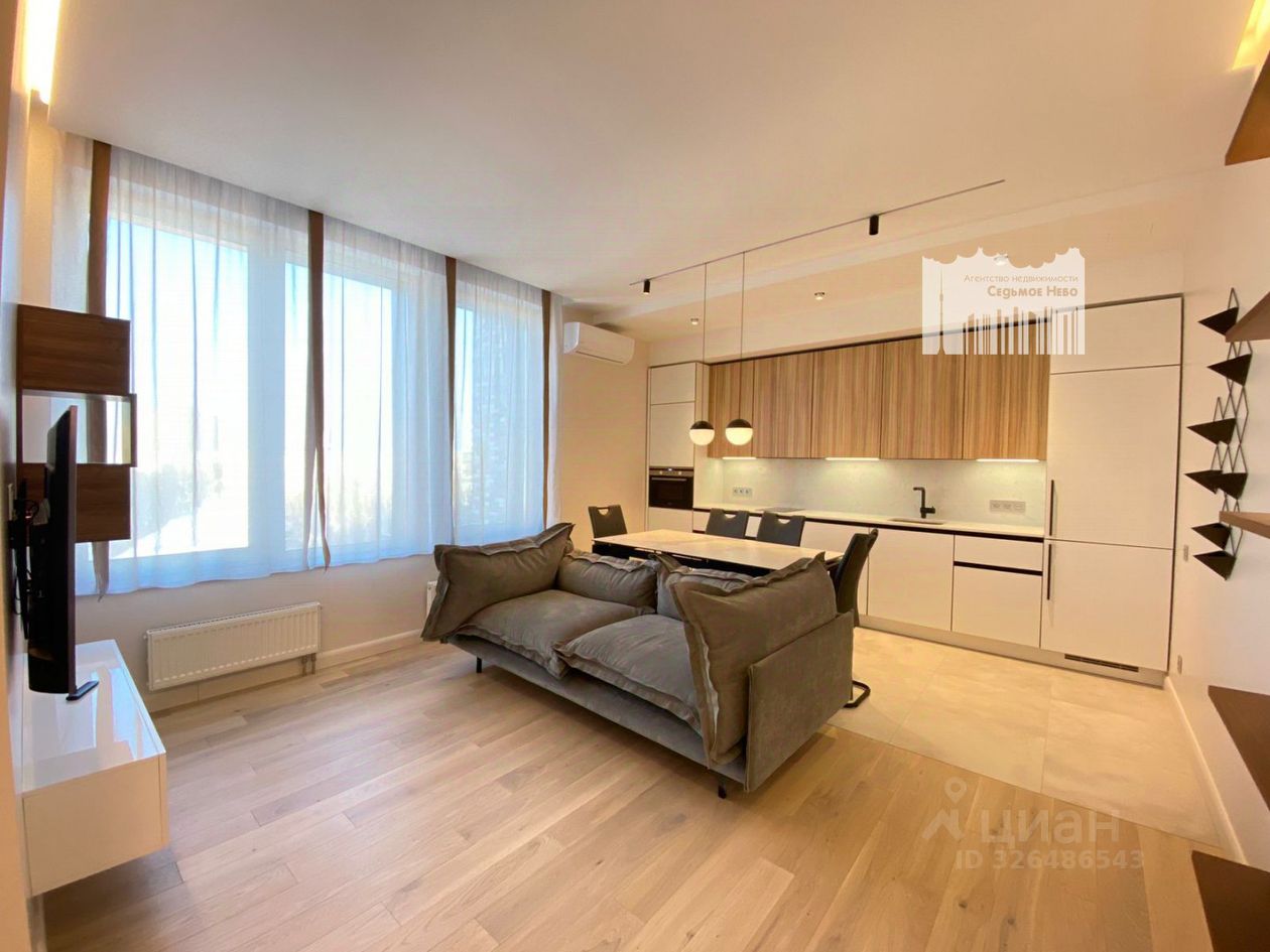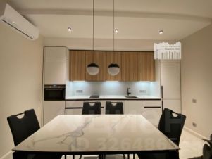 Вместительная комната-гостиная (30 м2) объединена с кухонной зоной (кухня выполнена по индивидуальному проекту и оснащена всем необходимым посудомоечная машина, холодильник, духовой шкаф с СВЧ.) Столешницы кухни и обеденного стола выполнены из искусственного кварца, черная сантехника Blanco.