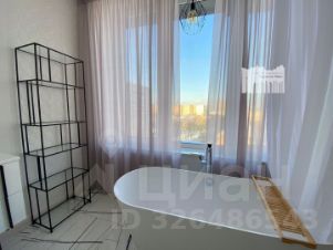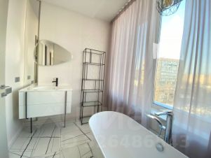Ванная комната (7 м2) с панорамным окном и островной ванной-чашей, деликатная подсветка плинтуса в вечернее время суток создает неповторимую атмосферу. Световой витраж между ванной комнатой и общей зоной прихожей выполнен из японского стекла, через которое дневной свет попадает в прихожую, наполняя ее в солнечный день золотистыми тонами.