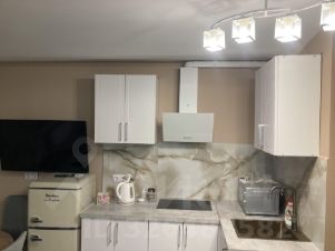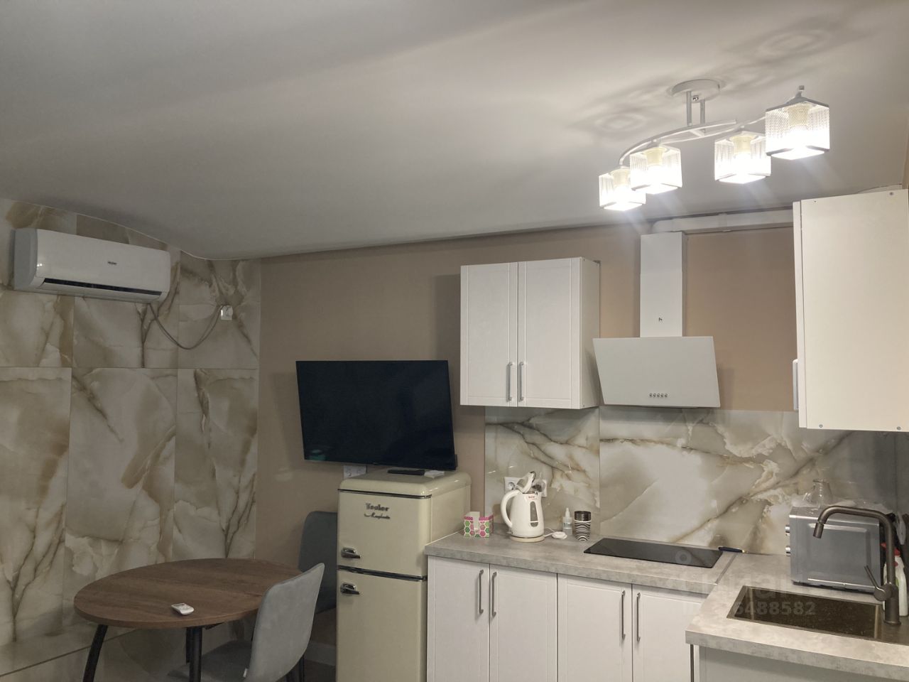 В апартаментах выполнен евроремонт, что создает современную и комфортную атмосферу. Просторная студия обставлена необходимой мебелью как в жилой зоне, так и на кухне. Для вашего удобства установлены кондиционер, холодильник, телевизор и стиральная машина. Ванная комната оборудована душевой кабиной.