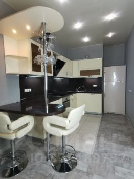 На кухне вытяжка, варочная электрическая поверхность, духовой шкаф, большой холодильник 75 см.