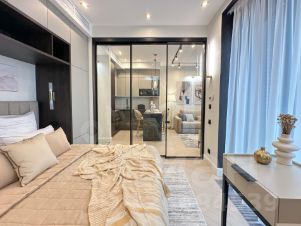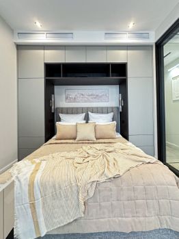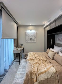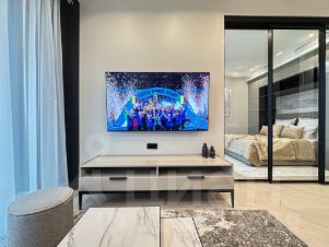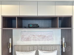 - спальная зона закрывается раздвижной стеклянной перегородкой, кровать с подъемным механизмом 160/200, дизайнерский стол для макияжа и ПРОЕКТОРОМ фото показано;