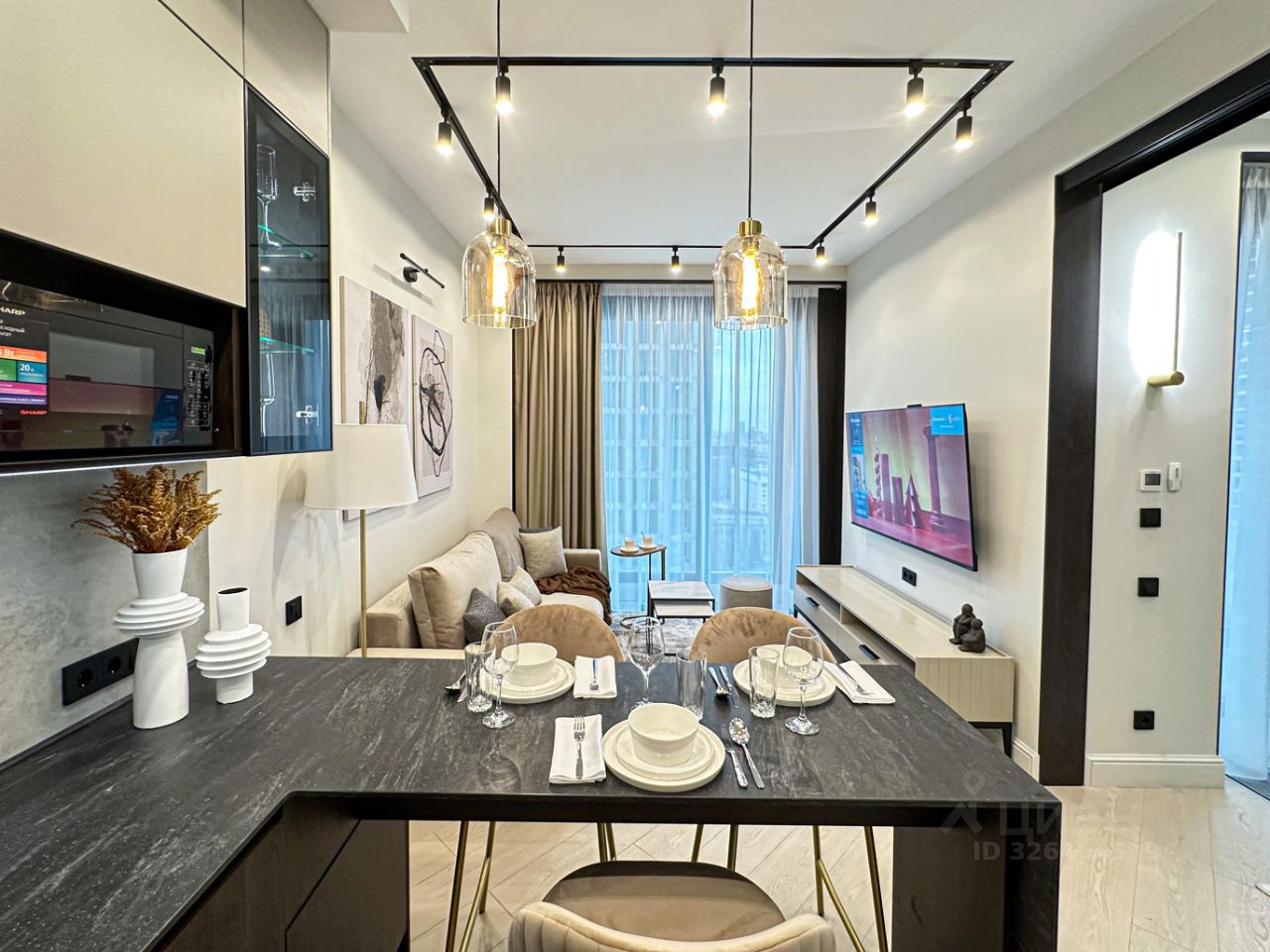 - гостиная зона телевизором, кофейными столиками, раскладной диван, с дизайнерским тубой под ТВ и торшер.