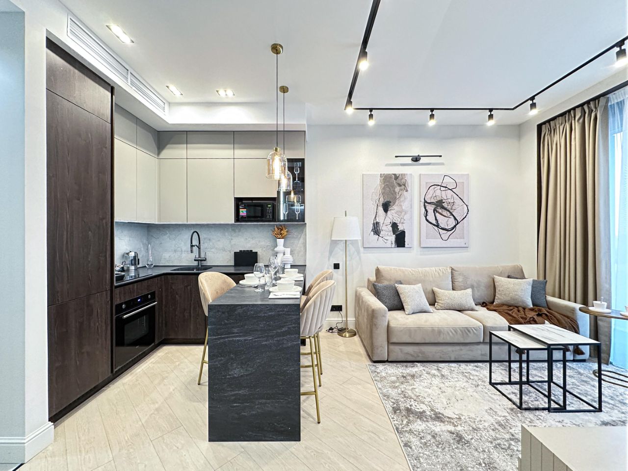 - кухонный гарнитур со всеми необходимыми бытовой техникой и барная стойка с тремя стульями