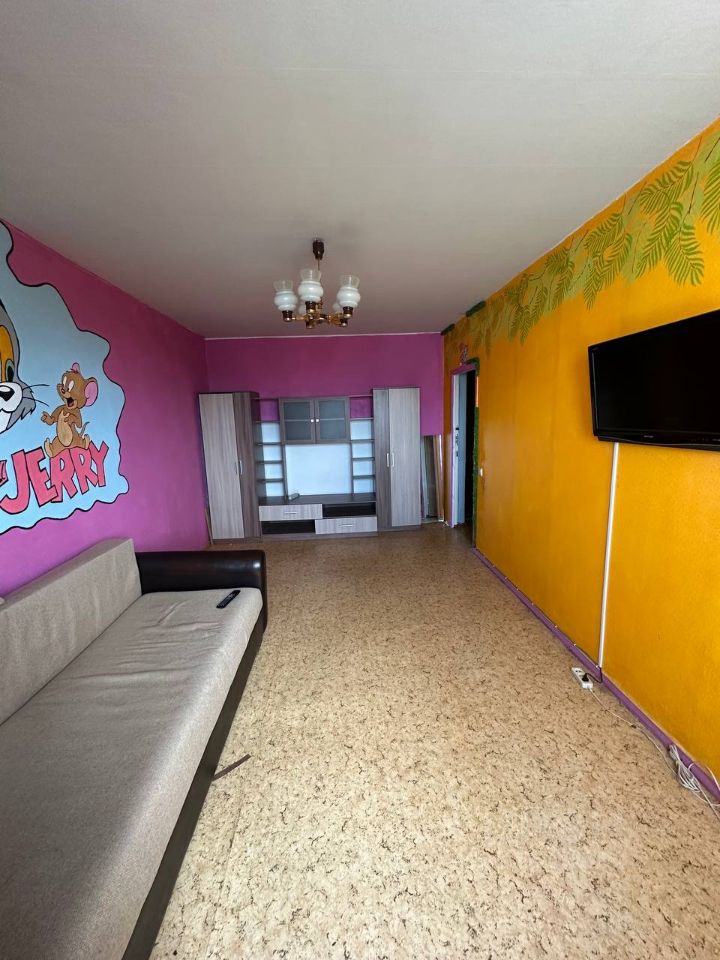 Комната просторная, светлая с балконом. Ремонт свежий, но яркий ( при желании арендатора можно перекрасить стены. Из мебели в комнате стенка, диван, тумба и телевизор. Квартира меблирована, с общей кухней и санузлом. Есть общие зоны хранения вещей.