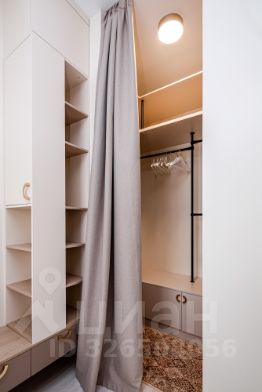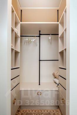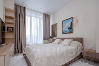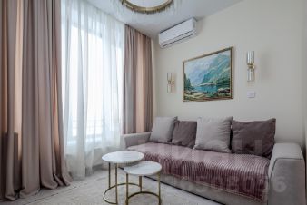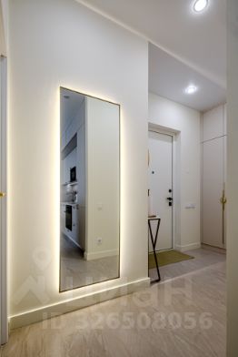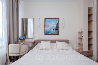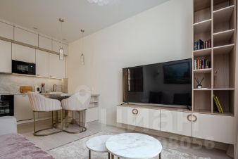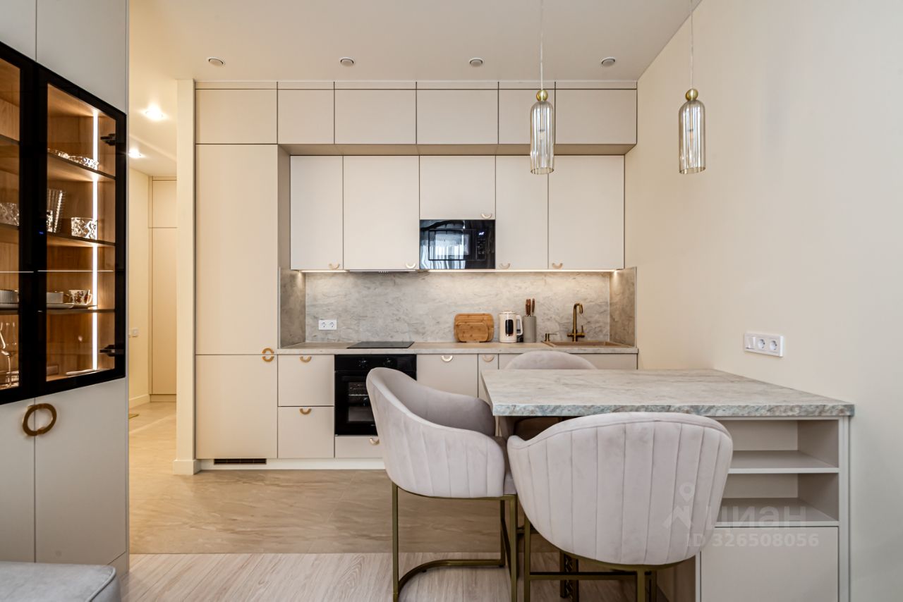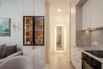 Квартира укомплектована мебелью: встроенная кухня, стол-остров с системами хранения и барными стульями, удобный раскладной диван, двуспальная кровать, шкафы для хранения с подсветкой, журнальные и туалетные столики.
