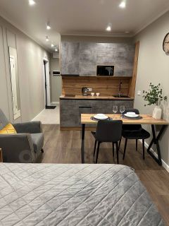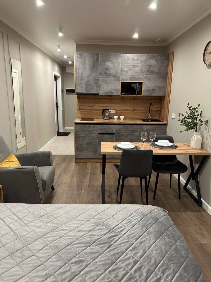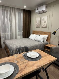Светлые апартаменты-студия с дизайнерским ремонтом, гармоничными цветами и продуманным пространством. Комфортная спальная зона, обеденный стол и функциональная кухня со всей необходимой техникой. Чисто, светло и по-домашнему уютно.