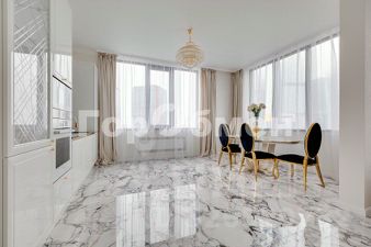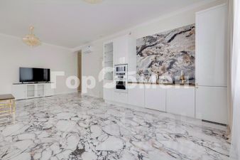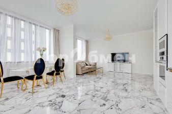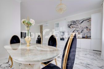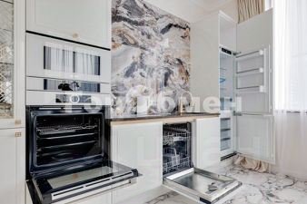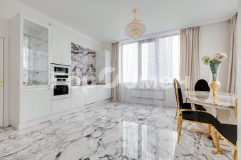 посудомоечная машина, индукционная плита, встроенный духовой шкаф, микроволновая печь, холодильник Liebherr. Обеденный стол с мраморной столешницей, обеденные стулья.
