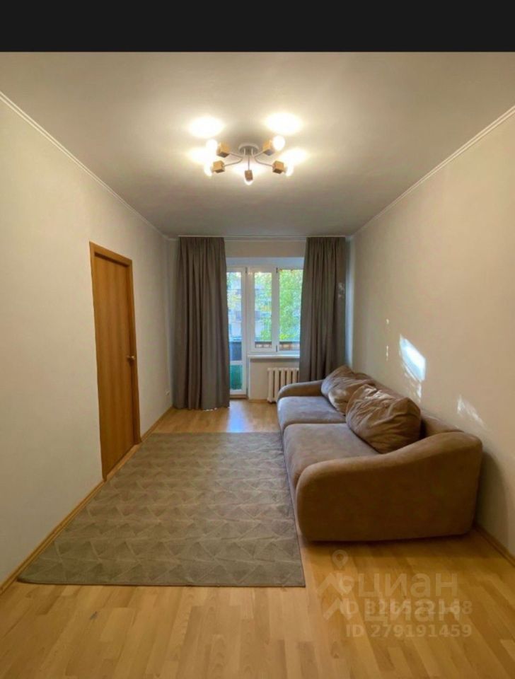 - Просторная гостиная с диваном с выходом на балкон.