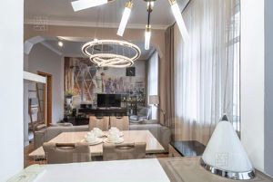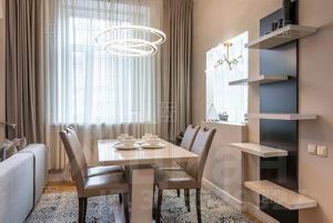 В квартире выполнен свежий, качественный ремонт по индивидуальному дизайнерскому проекту. Квартира полностью меблирована и оборудована современной бытовой техникой от ведущих мировых производителей. Функциональная планировка: кухня, гостиная, 2-ве изолированные спальни, гардеробная, разделенный санузел. Также, предлагается полный комплект посуды. Квартира оснащена системой кондиционирования воздуха.