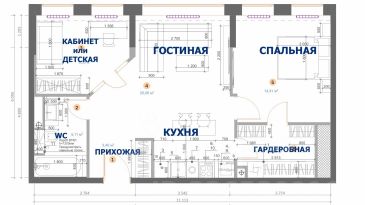 Из гостиной, которая является центром квартиры, предусмотрены входы в спальню, гардеробную и кабинет.