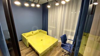 Кабинет отделён стеклянной звукоизоляционной перегородкой, установлен раскладной диван и рабочий стол. Кабинет можно использовать как жилую комнату или детскую.