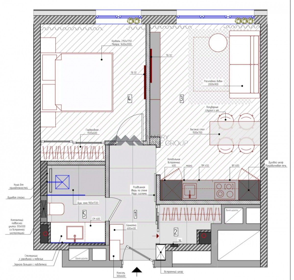 Оснащение: Кондиционирование, теплый пол во всех зонах, кроме спальни, трековое освещение/подсветка.