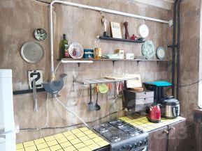 + Атмосферная кухня оборудована техникой и мебелью для приготовления пищи.