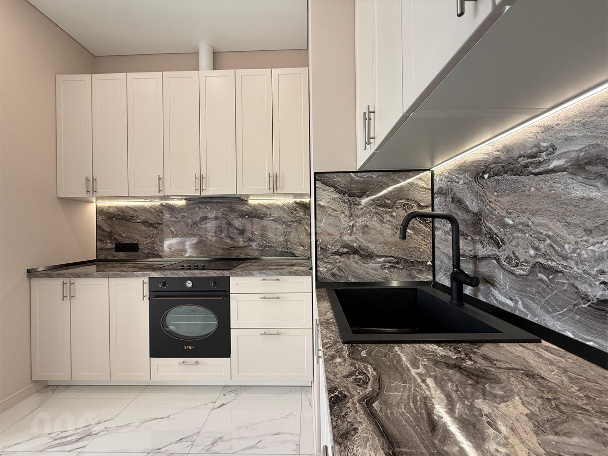 Апартамент с дизайнерским ремонтом, продуманным до мелочей. Высокие потолки 3.2 метра создают ощущение простора. В апартаментах три комнаты и два совмещенных санузла, в одном из которых установлена ванна, а в другом — душевая кабина. Кухня площадью 15 кв. м оснащена всей необходимой техникой: холодильником, посудомоечной машиной, кондиционером, стиральной машиной и телевизором. Для вашего комфорта мебель установлена как на кухне, так и в комнатах.