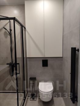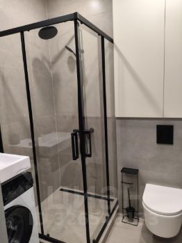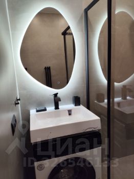 В квартире один совмещенный санузел с душевой кабиной, раковиной и зеркалом с подсветкой и стиральной машиной.