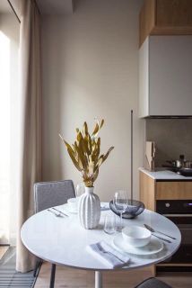 - кухонная зона: обеденный стол с двумя стульями, кухонный гарнитур со всей необходимой бытовой техникой и посудой;
