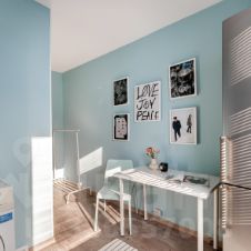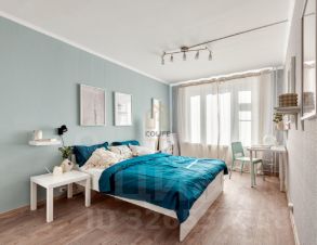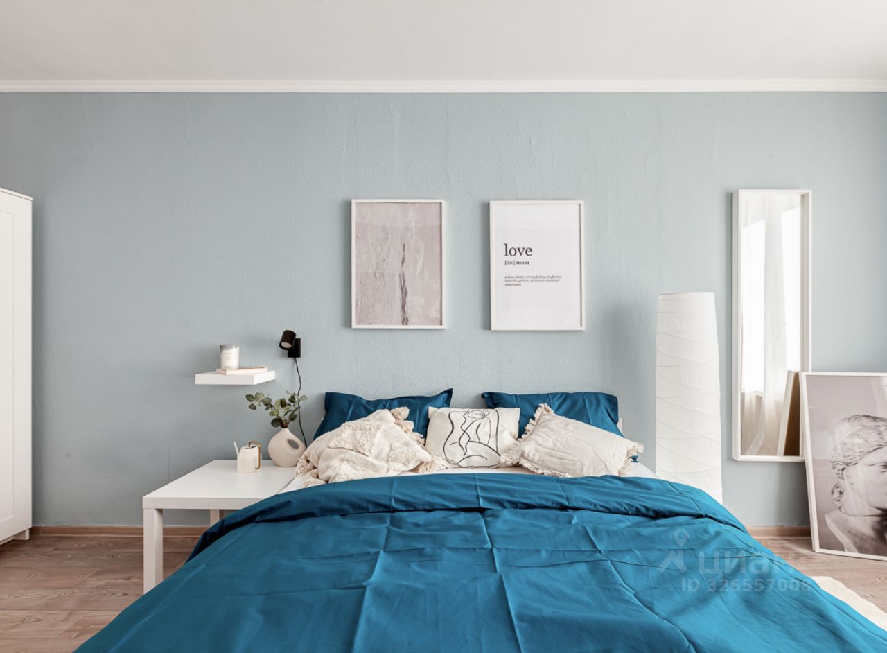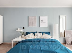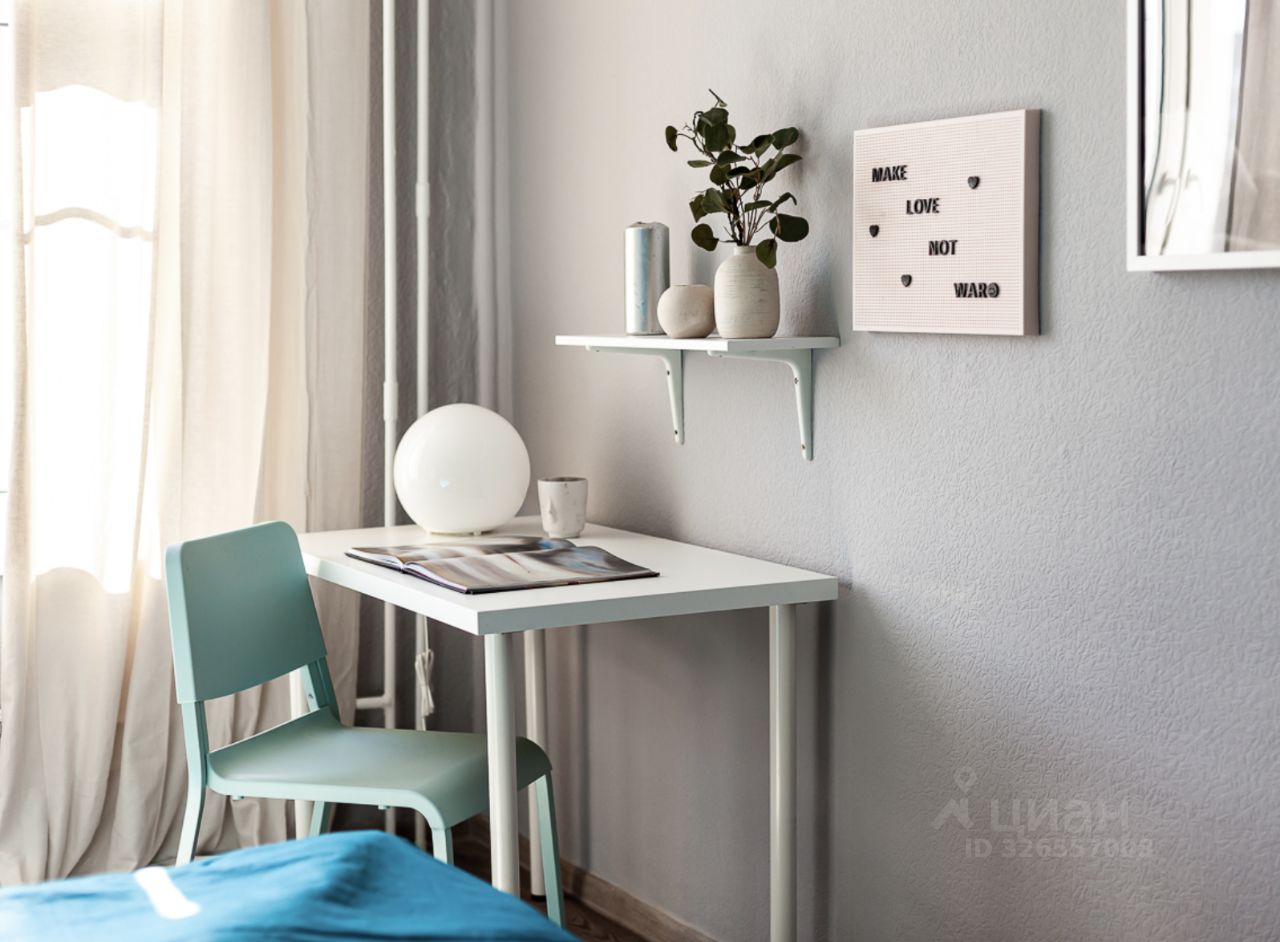 Пространство грамотно зонировано и оформлено в современном дизайнерском стиле. В комнате площадью установлена удобная кровать 160200, есть прикроватный столик, напольный торшер, вместительный комод и шкаф для хранения вещей, а также зеркало в полный рост. Для работы или учебы оборудована полноценная рабочая зона с письменным столом, настольной лампой и полками для книг.