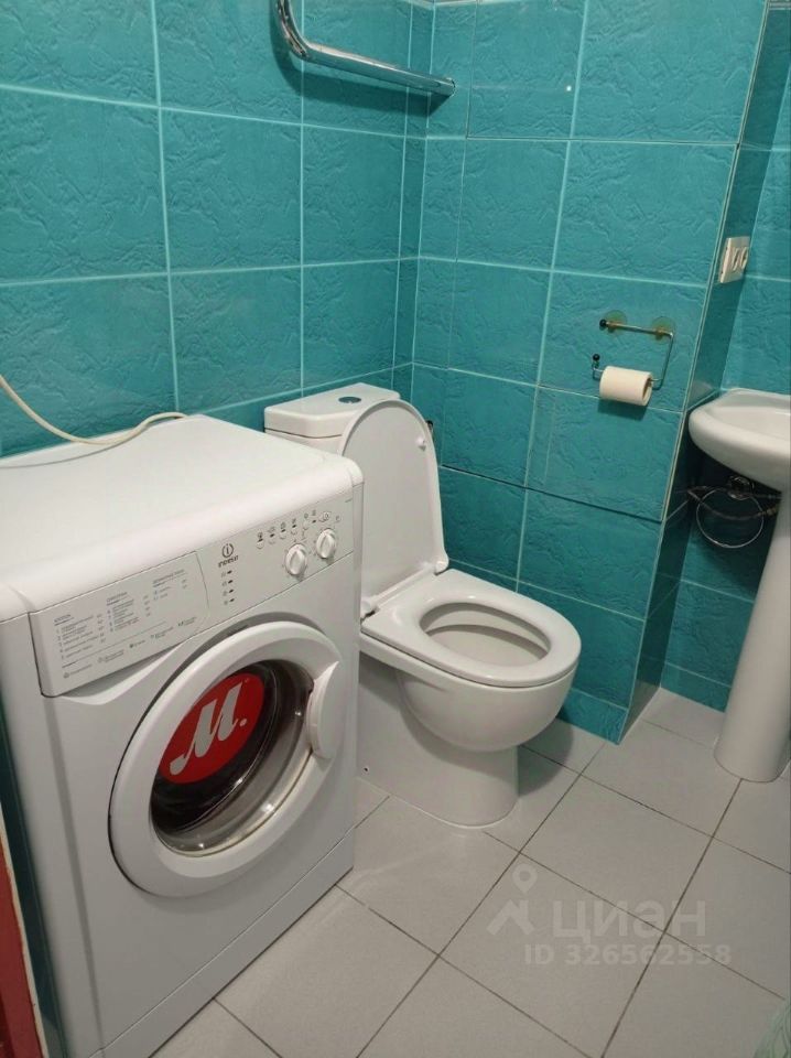 Санузел совмещенный, с ванной, установлена стиральная машина.