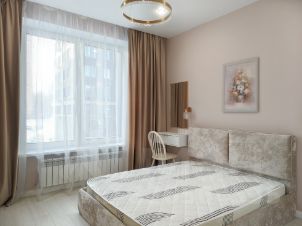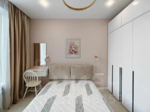 В спальне установлена большая двуспальная кровать. Большой шкаф для хранения одежды и комод. Туалетный столик с зеркалом. Предусмотрены разные варианты освещения помещения такие как люстра с разными цветами свечения, точечные светильники и ночники. Блэкаут шторы для комфортного сна.